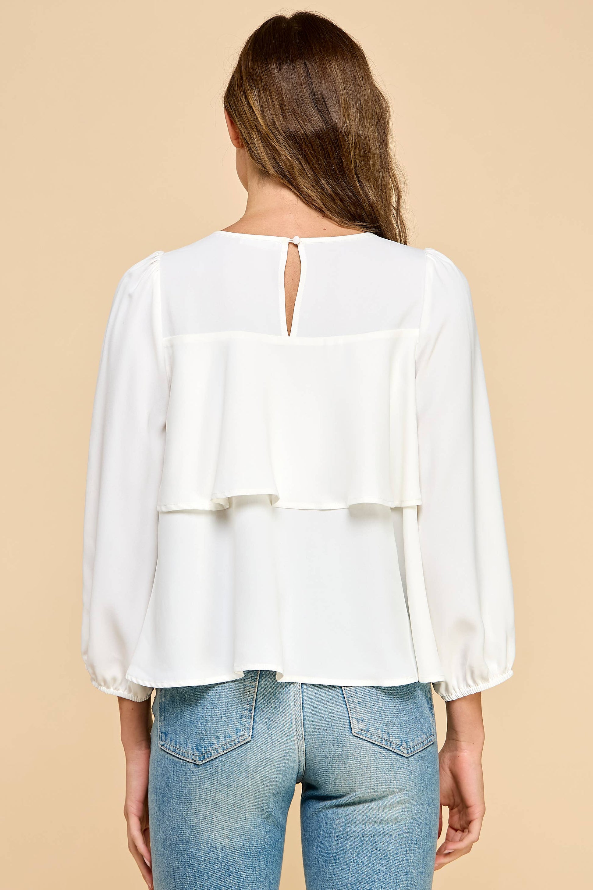 Round neckline blouse with a tiered ruffle hem. Featuring a back buttoned keyhole closure.
