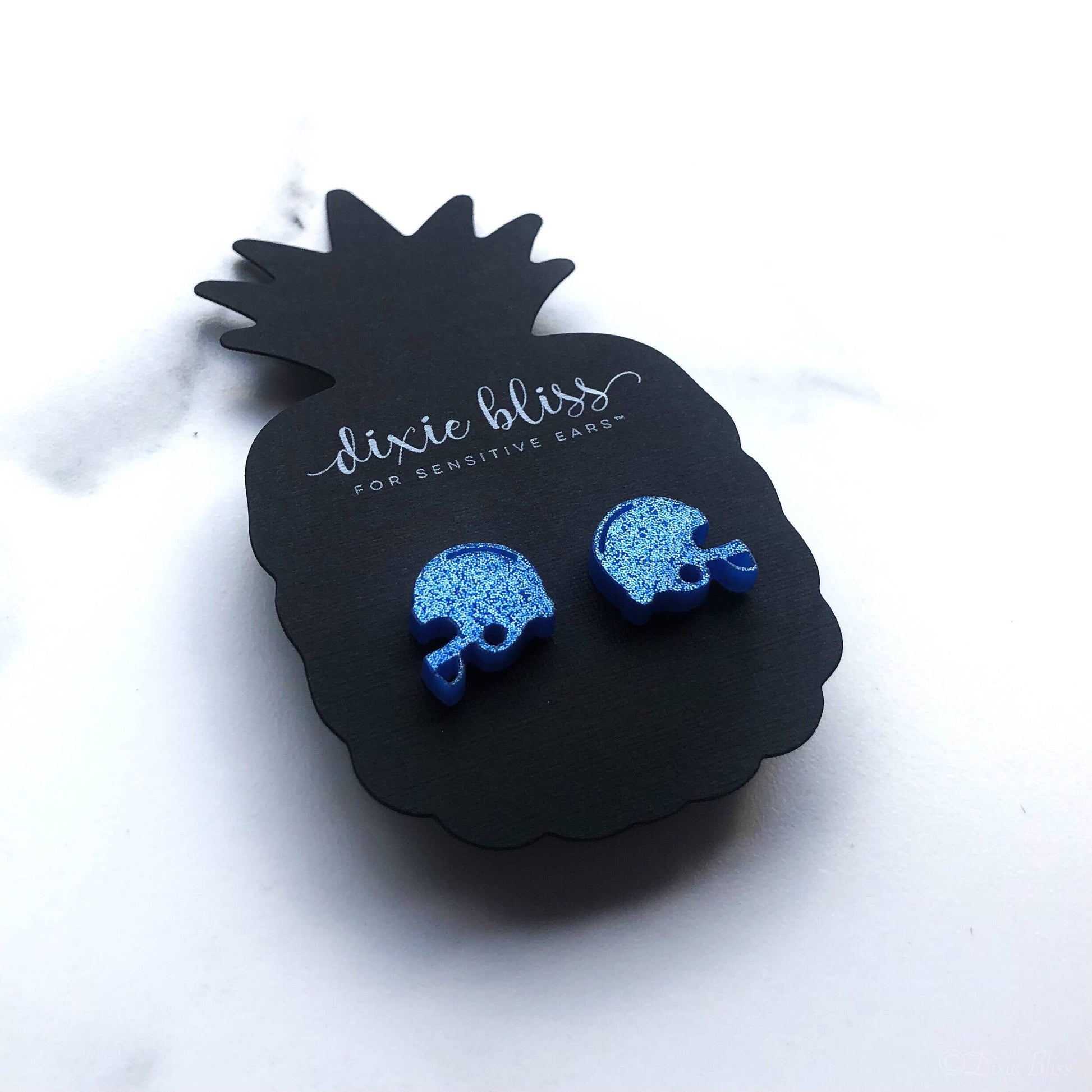 Football Helmets feature: *Dixie Bliss Exclusive design *12x14mm *Glitter Acrylic *Details are cut through the acrylic *Hypoallergenic surgical stainless steel posts *Great for sensitive ears! *Made in the USA
