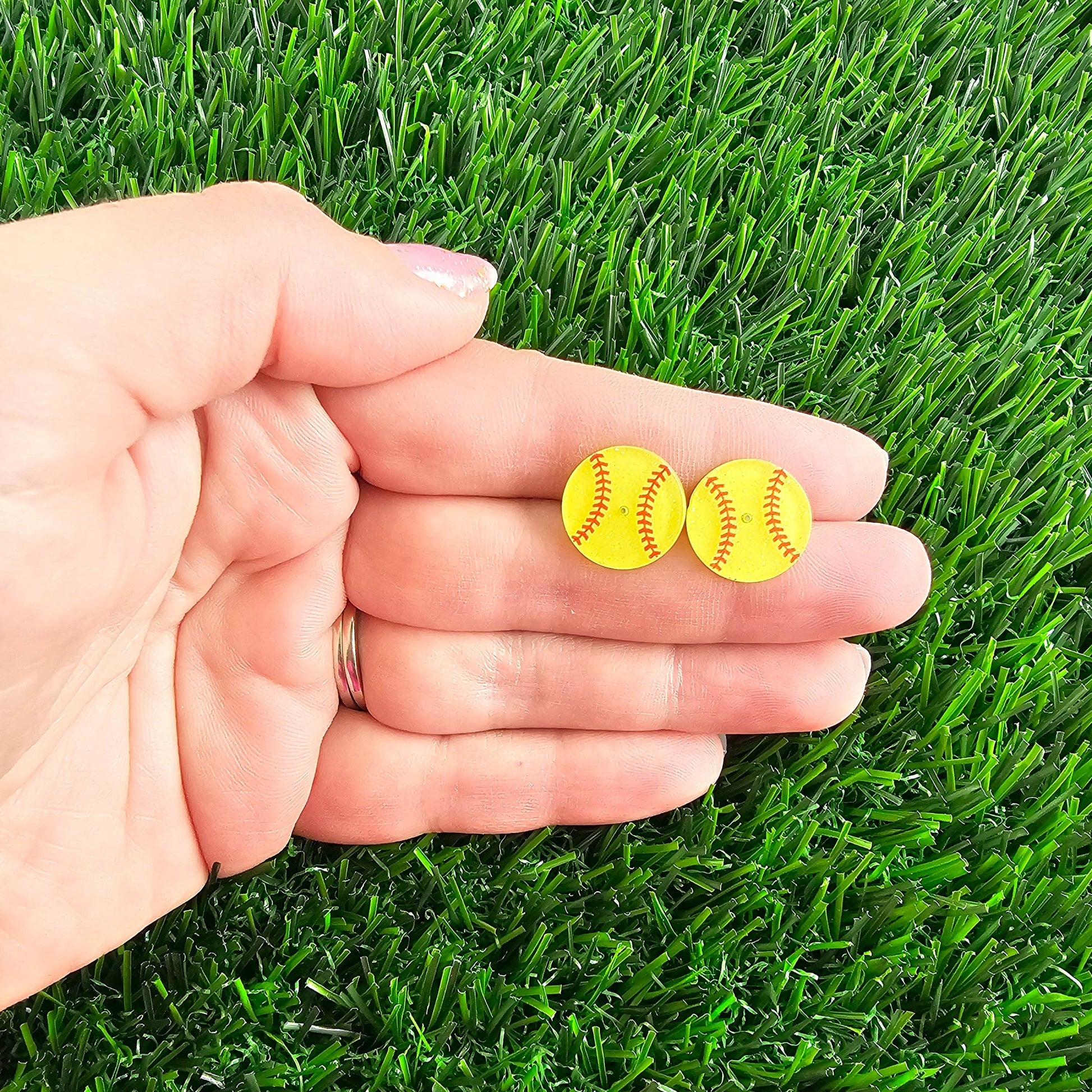 Hit a home run with these Glitter Softball Studs. Made with sparkling glitter, these studs add a touch of bling to any outfit. Perfect for softball fans and fashionistas alike. * Hypoallergenic stainless steel posts * Lightweight and durable glitter acrylic