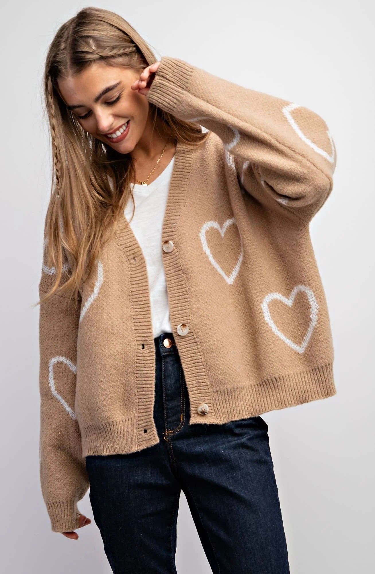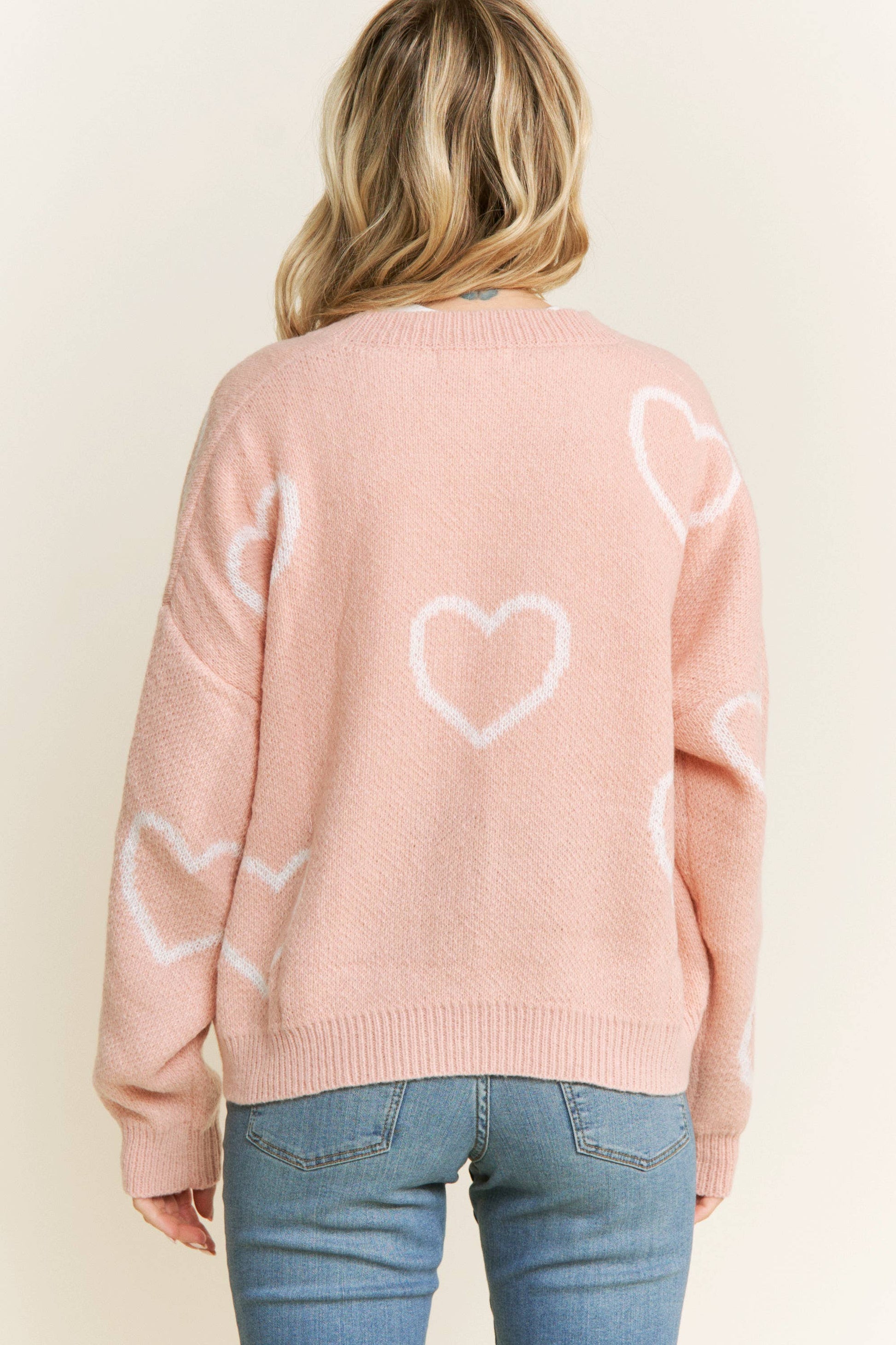 All Over Heart jaquard shape Sweater Cardigan -Open Front -Rib bands on neckline and bottom hems - Model in Ivory is 5' 8" 32-23-34 and wearing a Small
