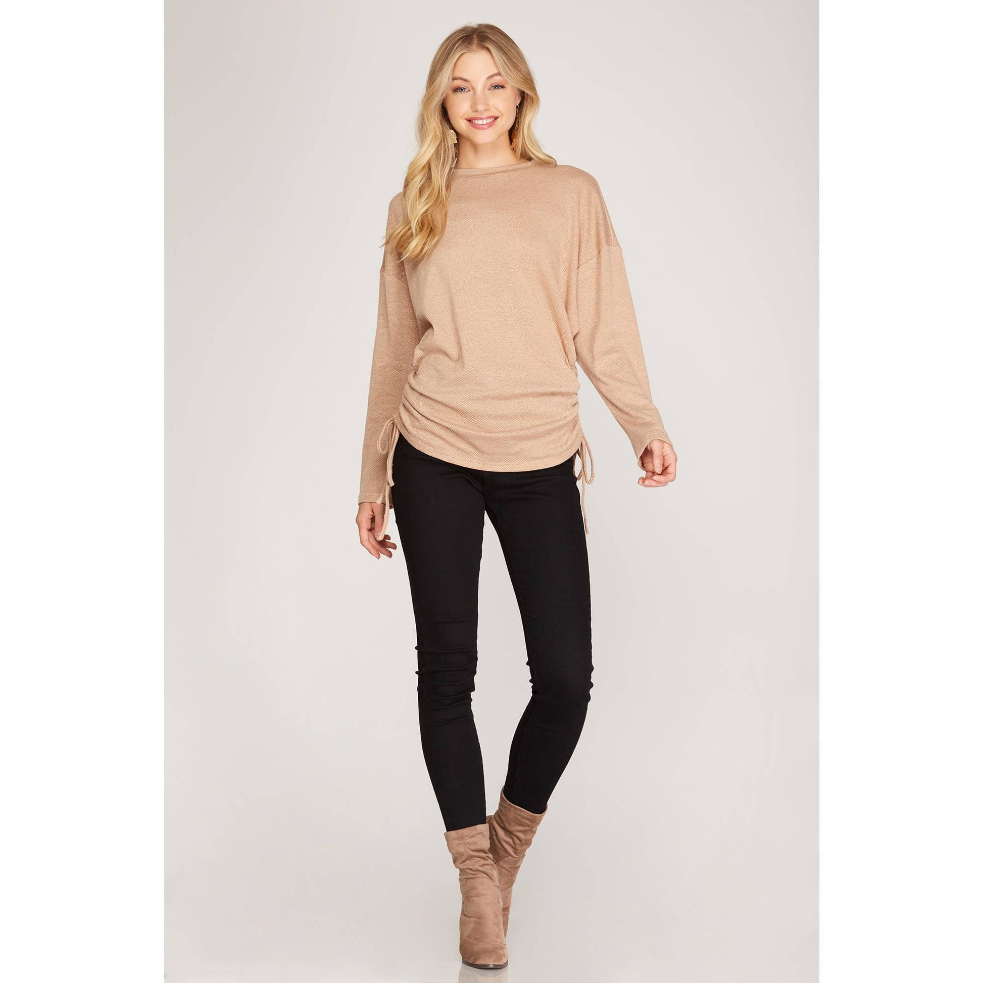 LONG SLEEVE TEXTURED KNIT TOP WITH RUCHED SIDES Fabric Contents 98%POLYESTER 2%SPANDEX KNIT TOP